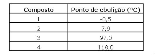 Em uma tabela, são dados 4(quatro) compostos orgânicos, representados pelos algarismos 1,2,3 e 4, e seus respectivos pontos de ebulição, à pressão de 1 atm. Esses compostos são propan-1-ol, ácido etanóico, butano e metoxietano, não necessariamente nessa ordem.