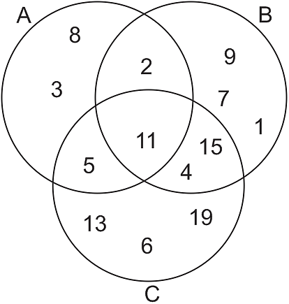 Considere o seguinte diagrama de Venn para os conjuntos A, B e C.