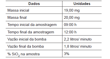 Em uma empresa siderúrgica, um determinado posto de trabalho utiliza SÍLICA. Com a finalidade de avaliar a insalubridade desse posto, o técnico de segurança do trabalho realizou uma avaliação de Poeira Respirável. Na Tabela a seguir, são fornecidos os dados dessa avaliação:
