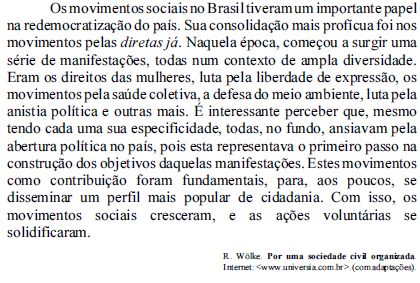 Em que pese a imensa diversidade dos movimentos sociais ocorridos no Brasil, é possível apontar alguns traços comuns a esses movimentos, tais como: (1) suas possibilidades no campo político democrático; (2) tipo de reivindicação dos grupos envolvidos; (3) obstáculo, real ou potencial, a esses movimentos. Assinale, entre as opções abaixo, a que lista uma seqüência de traços comuns que correspondem, respectivamente, aos aspectos (1), (2) e (3) listados.