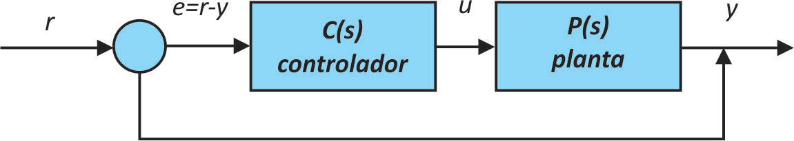 Um analista técnico eletrônico deseja analisar teoricamente a estabilidade de um sistema de malha fechada como mostrado na figura abaixo, sendo r o sinal de referência, u o sinal de controle e y o sinal controlado.