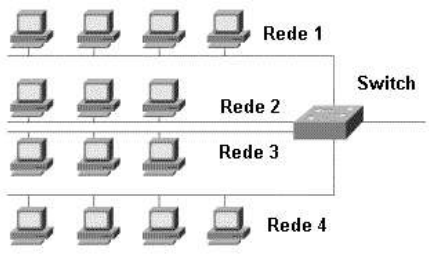 I.Existem 04 redes distintas conectadas ao Switch, os computadores de cada rede podem se comunicar entre si, mas não com os computadores de redes diferentes.