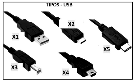 Com base na imagem, pode-se afirmar que X1, X2, X3, X4 e X5 identificam, respectivamente, os conectores USB de tipos conhecidos por:
