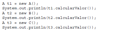 Um desenvolvedor Java SE possui, em uma aplicação, duas subclasses B e C, estendendo a mesma superclasse A. Na superclasse A há um método calcularValor, também presente nas duas subclasses B e C, mas implementado de maneiras diferentes. A partir do método main de uma classe principal, utilizou-se o seguinte bloco de código: