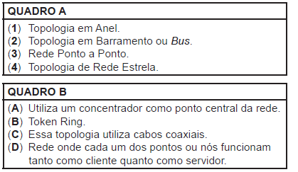 Relacione os números das topologias de redes de computadores do quadro A com as respectivas letras das definições (ou exemplos) dessas topologias presentes no quadro B: