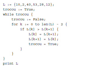 Esse algoritmo deveria ordenar os elementos do array em ordem crescente, mas há problemas no código que produzem resultados errôneos.