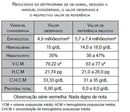 Deficiências nutricionais podem determinar alterações metabólicas que se refletem na composição do sangue circulante dos animais. Na tabela a seguir são apresentados os valores observados em um eritrograma de um animal e os respectivos valores de referência.